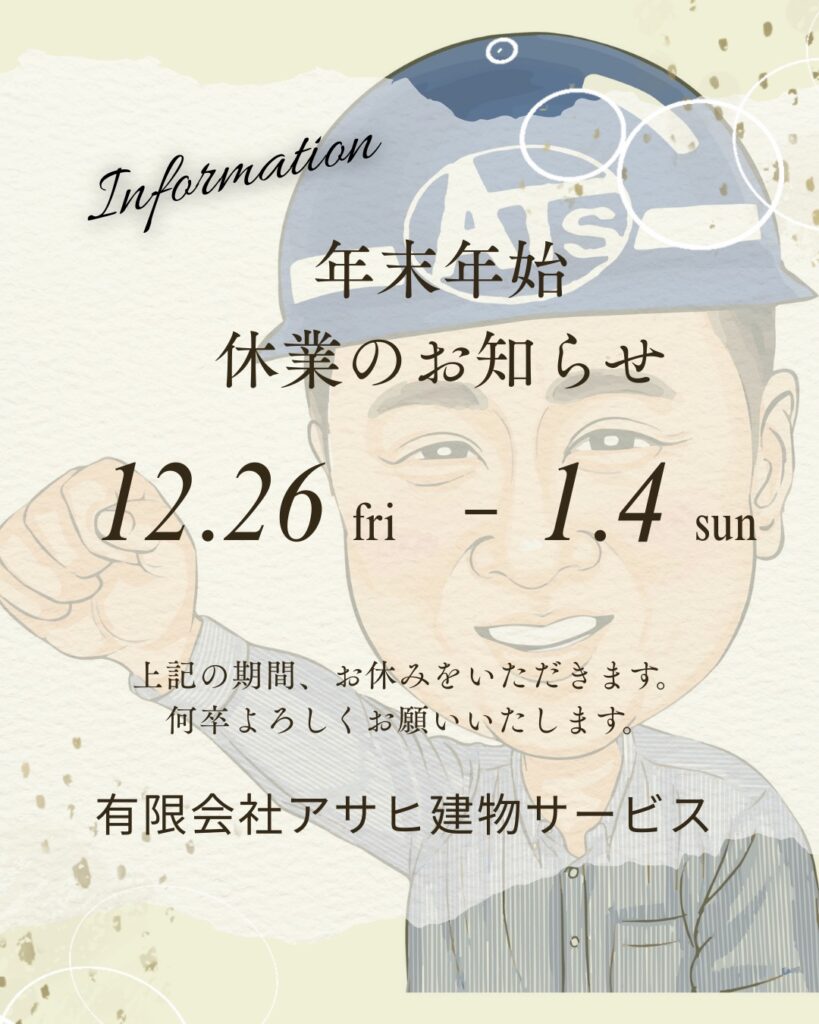 みなさんこんにちは(*^^*) 今年も残すところ後7日となりました! 長かったような~短かったような~と毎年思っている気がします(*´ω`*) 2025年やり残したことがないよう新年を迎えましょう♪ 年末年始は勝手ながら12月26日(金)~1月4日(日)の期間お休みさせていただきます。 2026年もアサヒ建物サービスをどうぞよろしくお願いいたします。...